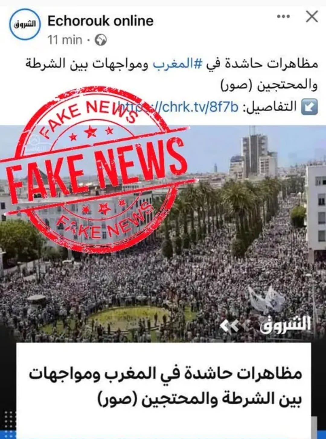 Ce mardi, le quotidien algérien Echourouk, récemment épinglé par la diplomatie russe, continue malgré tout de jouer un rôle clef dans la viralité des divers contenus mensongers liés au Maroc. L’organe propagandiste a allégué que les cortèges qui avaient manifesté en fin de semaine «ont échappé à l’encadrement des forces de l’ordre» entraînant «quelques incidents graves», voire «des dizaines de blessés». Cela survient après que les sources de Barlamane.com ont débusqué plusieurs pages algériennes qui agissaient «de manière coordonnée en mettant en ligne des vidéos liées aux manifestations au Maroc». Une image, diffusée par Echourouk, n’a rien à voir avec les événements : il s’agit, comme l’ont immédiatement remarqué plusieurs spécialistes, d’un cliché issu d’une manifestation ayant eu lieu dans le nord en 2017.