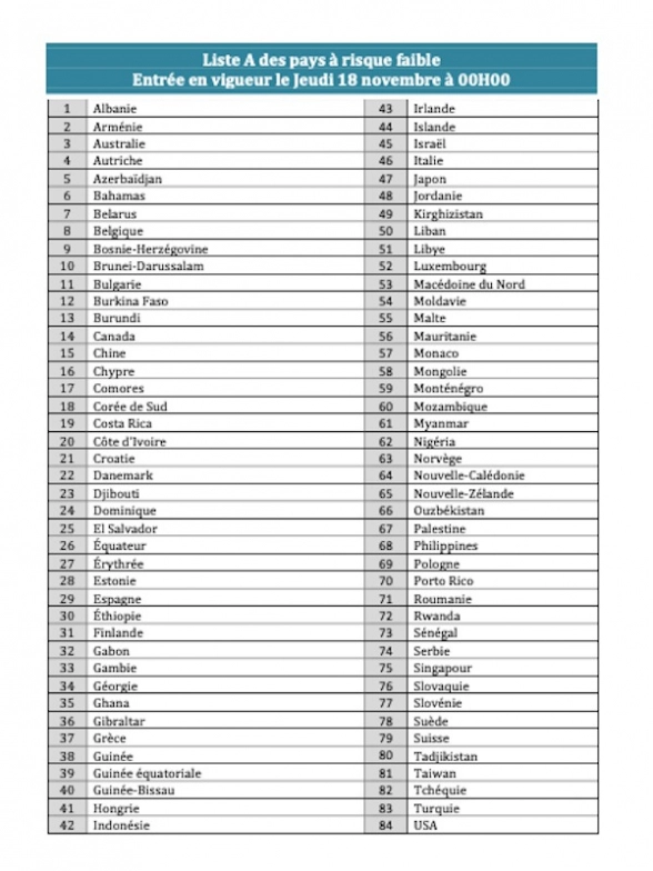 Les voyageurs de la liste A doivent présenter un certificat attestant qu’ils sont complètement vaccinés contre le Covid-19. Les voyageurs de la liste B sont tenus de présenter un certificat attestant qu’ils sont complètement vaccinés et un test PCR négatif datant de moins de 48 heures (délai entre prélèvement et embarquement).