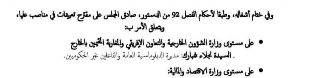 «Au niveau du ministère des Affaires étrangères, de la coopération africaine et des Marocains résidant à l’étranger, le Conseil a approuvé la nomination de Mme Najlae Benmbarek au poste de directrice de la diplomatie publique et des acteurs non étatiques», a indiqué le porte-parole du gouvernement, Saaid Amzazi, lors d’un point de presse.