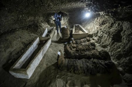 «Nous avons retrouvé des catacombes, qui contenaient un certain nombre de momies», a indiqué ce samedi lors d’une conférence de presse Salah al-Khouli, à la tête de l’équipe d’archéologues de l’université du Caire responsable de cette découverte. Cette «cachette de momies non-royales», un dédale de corridors souterrains, abritait «17 momies et un certain nombre de sarcophages», sculptés dans de la pierre ou de l’argile, selon un communiqué du ministère des Antiquités, distribué lors de la conférence de presse, dans la région désertique de Touna-el-Gabal, dans la province de Minya, à quelque 200 km au sud du Caire.