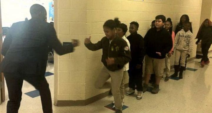 Un professeur de Caroline du Nord réalise avec chacun de ses élèves un handshake personnalisé quand il rentrent en classe.