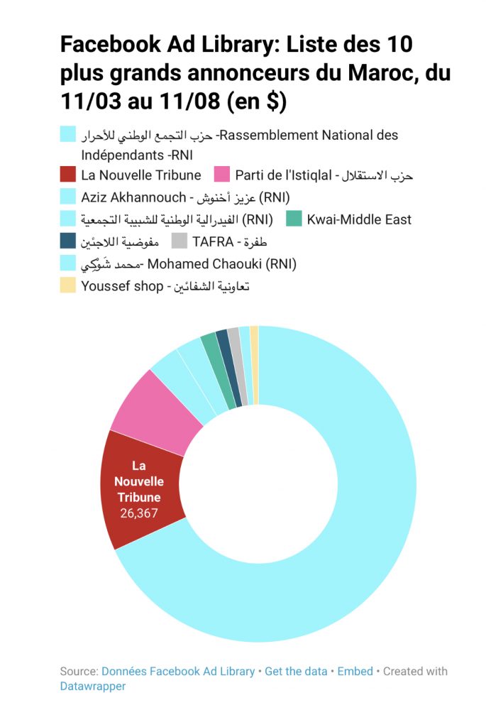 Le Rassemblement national des indépendants (RNI) a de loin été le plus dépensier. 144 514 $ (1,29 MDH) rien que pour la page officielle du RNI. 159 568 $ (1,43 MDH) si l’on inclut dans le décompte les pages officielles de Aziz Akhannouch (7082 $), de la jeunesse RNIste (5623 $) et de Mohamed Chaouki, membre du bureau exécutif du parti (2349 $), ce qui équivaut à 64,8% du total des publicités comptabilisées pour le Maroc, toutes pages confondues.