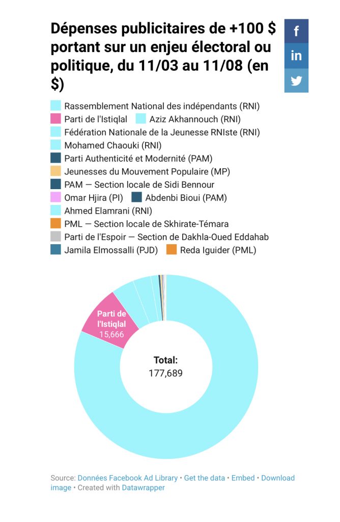 Si l’on ne prend en considération que de la publicité à enjeu électoral d’une valeur supérieure à 100 $, le RNI et ses candidats accaparent plus de 90% des dépenses, suivis de très loin par l’Istiqlal (15 857 $, soit 142 240 dirhams). Huit autres pages Facebook de formations politiques et de candidats se partagent le reste.