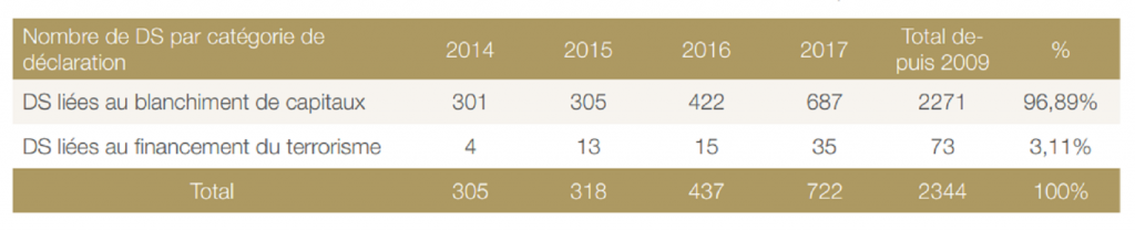 En effet, durant les années 2016 et 2017, l’UTRF a reçu respectivement un total de 437 et 722 déclarations de soupçons (DS) liées à des cas de blanchiment de capitaux et de financement du terrorisme, portant ainsi le nombre total de DS à 2344 depuis la création de l’Unité en 2009.