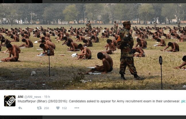 Inde: Des candidats voulant intégrer l’armée forcés de passer leurs examens en sous-vêtements