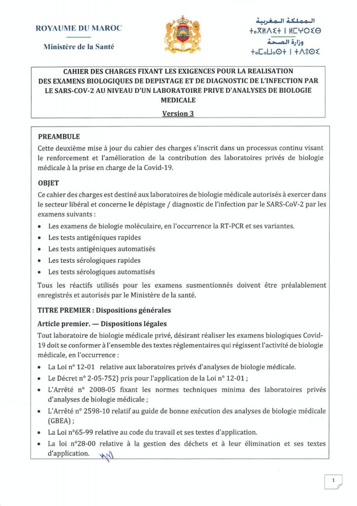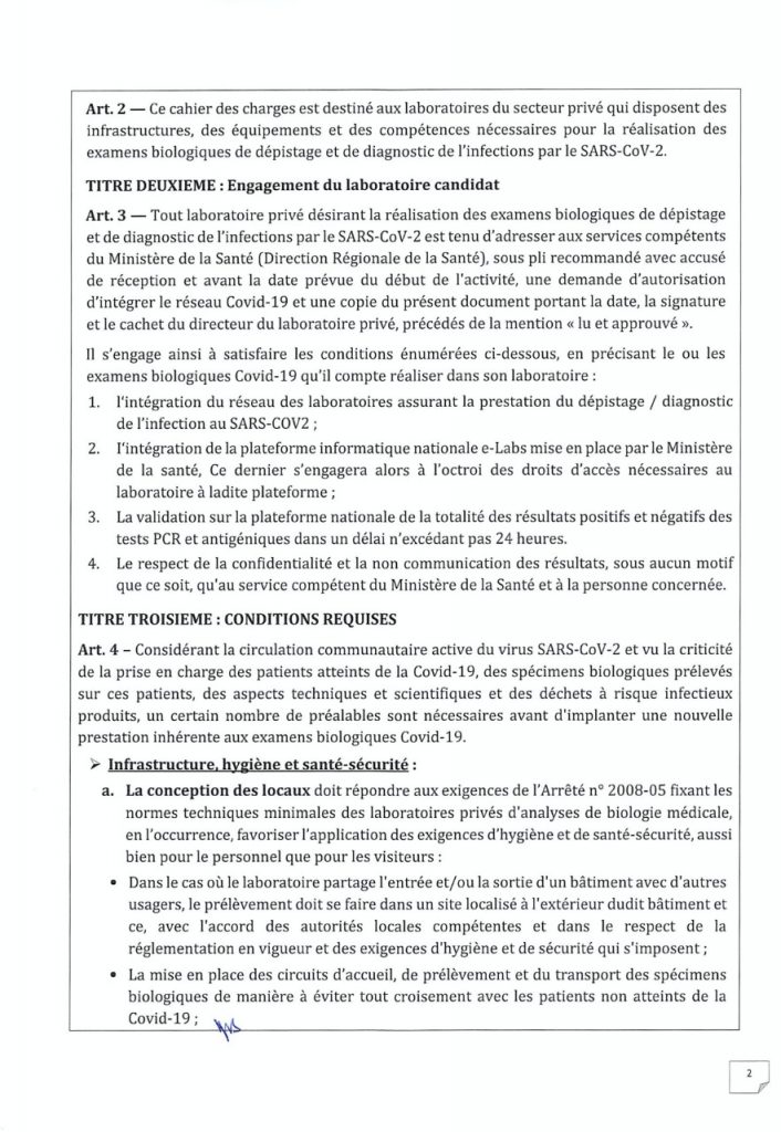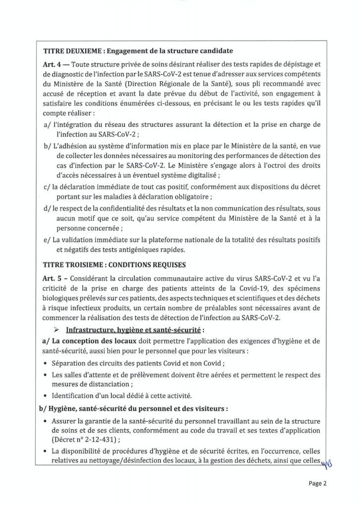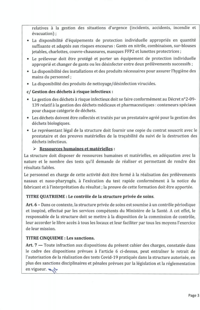 A cet effet, un cahier des charges fixant les exigences pour la réalisation des tests antigéniques et sérologiques rapides de dépistage et de diagnostic de l’infection par le Sars-Cov-2 au niveau d’une structure de soins privées, est publié.