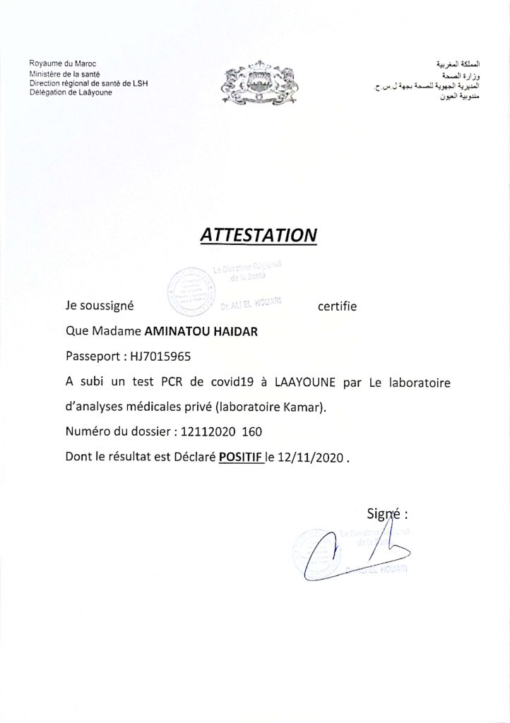 Haidar a quitté l’aéroport Hassan Ier après avoir été contactée par un fonctionnaire médical relevant de la cellule Covid-19 de la délégation régionale de Laâyoune, qui lui a affirmé qu’elle ne peut prendre part au voyage tant qu’elle n’est pas guérie.