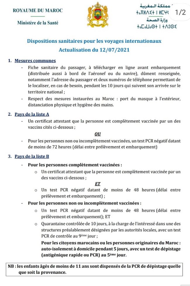 Dans un document parvenu à Barlamane.com, le ministère précise que pour les pays de la liste A, sont exigés un certificat attestant que la personne est complètement vaccinée par un des vaccins acceptés au Maroc ou un test PCR négatif datant de moins de 72 heures (délai entre prélèvement et embarquement) pour les personnes non ou incomplètement vaccinées.