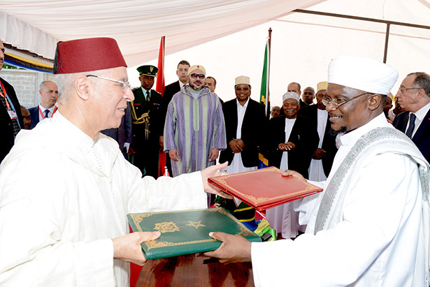Cette cérémonie au cours de laquelle le roi Mohammed VI a fait don de 10.000 exemplaires du Saint Coran au Conseil national des musulmans de Tanzanie, a constitué l’occasion pour le ministre des Habous et des Affaires islamiques, Ahmed Toufiq, et le Mufti Aboubakr Ben Zoubeir Ben Ali, de procéder à la signature d’un accord de coopération dans les domaines des Affaires islamiques, de l’enseignement authentique, des mosquées et des Habous.